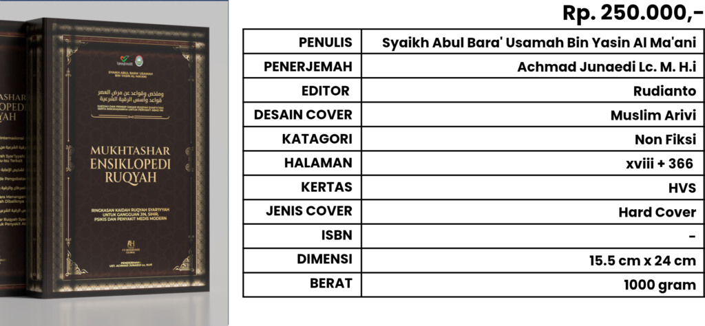 Buku ini merupakan ringkasan komprehensif dari kaidah-kaidah ruqyah syar’iyyah yang bersumber dari Al-Qur’an, As-Sunnah, serta penjelasan para ulama klasik dan kontemporer. Disusun oleh *Syaikh Abul Bara’ Usamah bin Yasin Al-Ma’ani*, seorang pakar ruqyah yang dikenal luas di dunia Islam, buku ini hadir untuk memberikan pedoman ilmiah, praktis, dan teruji dalam menghadapi ragam penyakit era modern—baik yang bersifat spiritual, psikis, maupun medis.